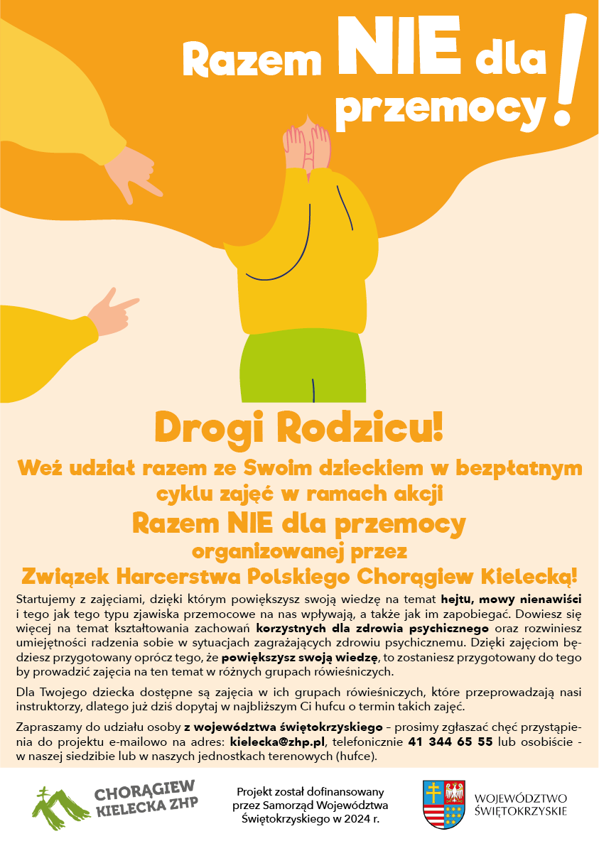 Drogi Rodzicu! Weź udział razem ze Swoim dzieckiem w bezpłatnym cyklu zajęć w ramach akcji Razem NIE dla przemocy organizowanej przez Związek Harcerstwa Polskiego Chorągiew Kielecką!